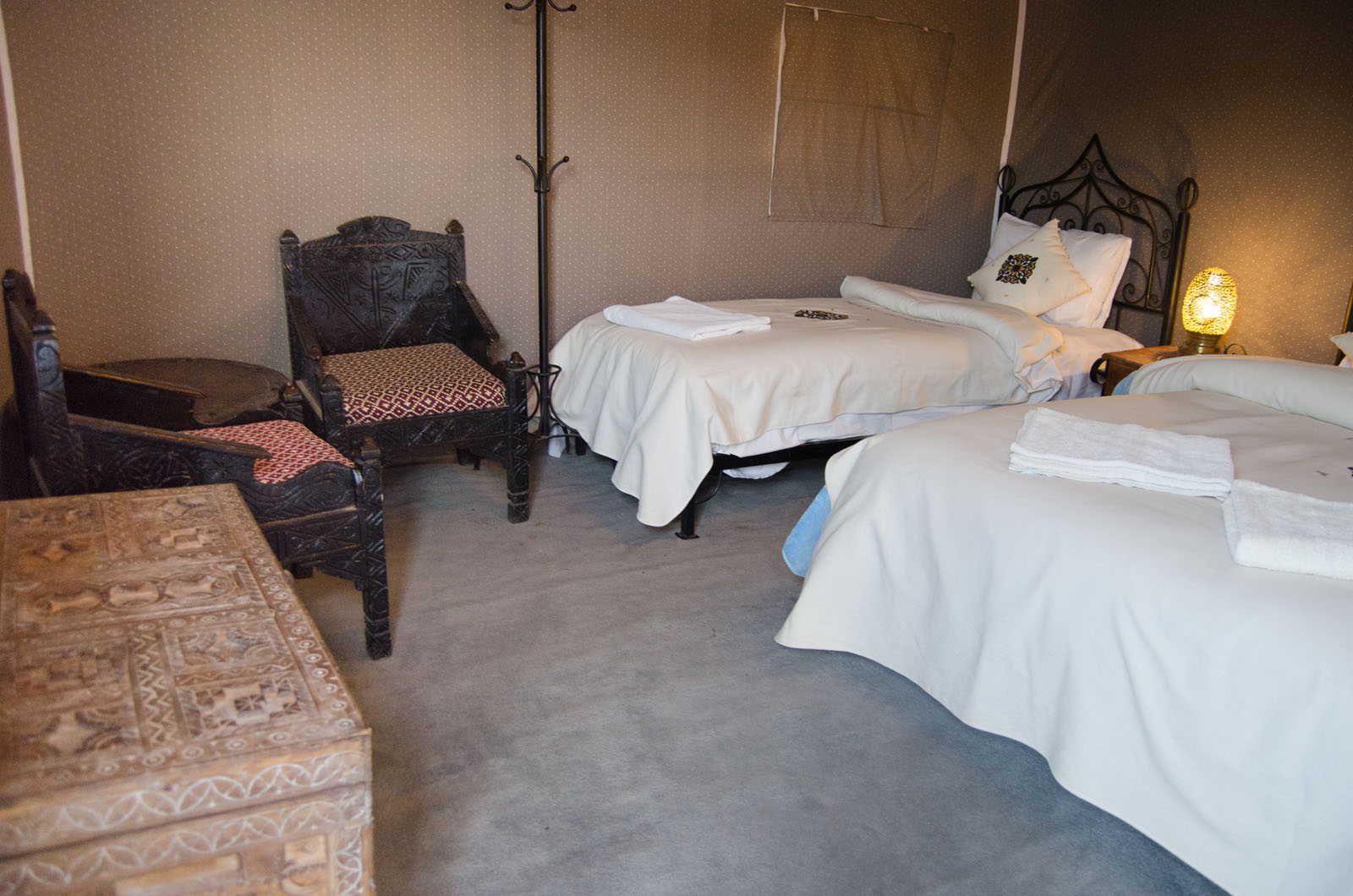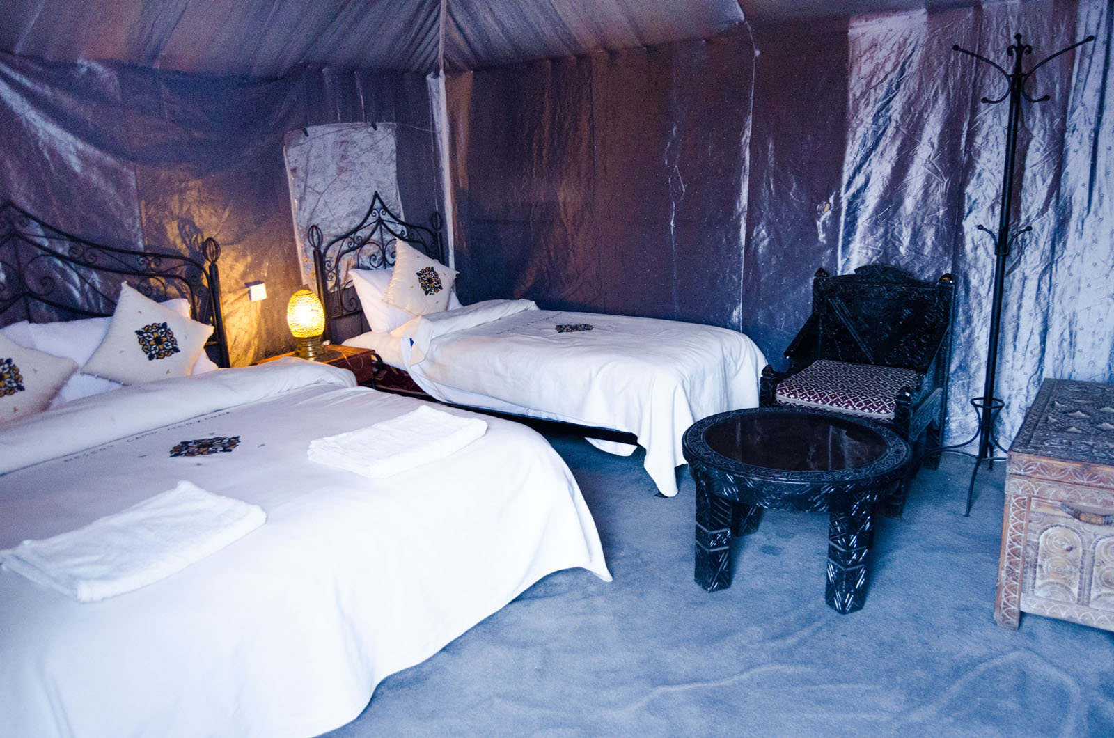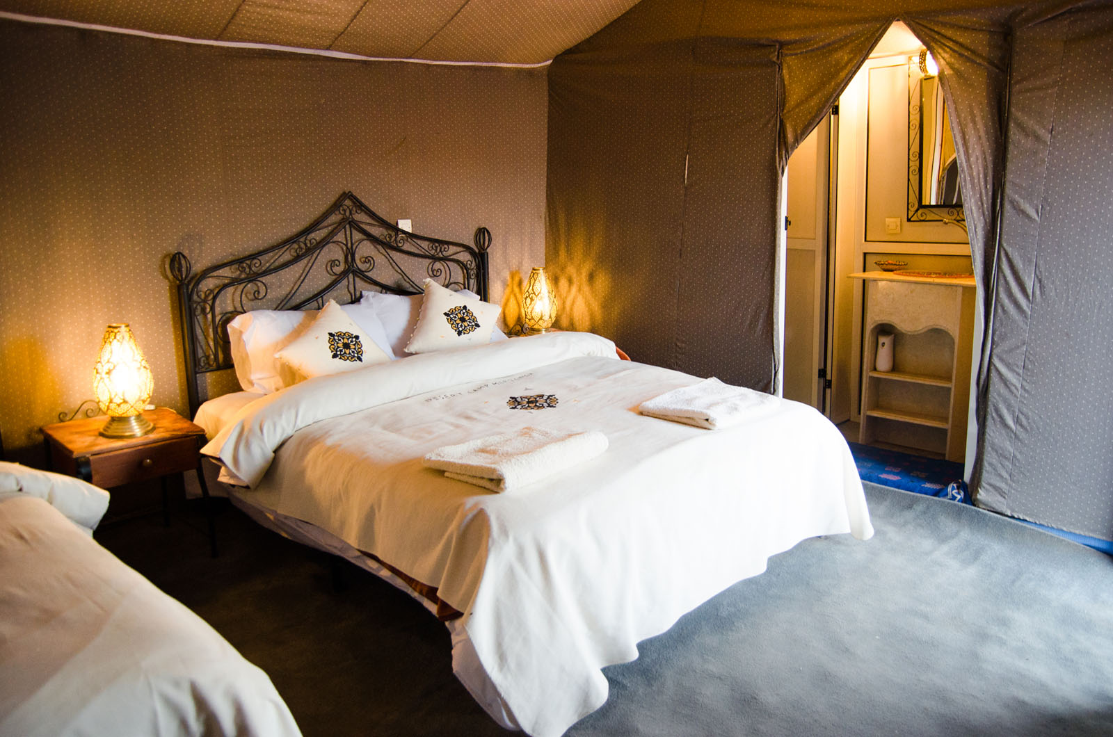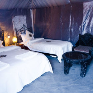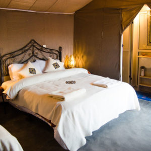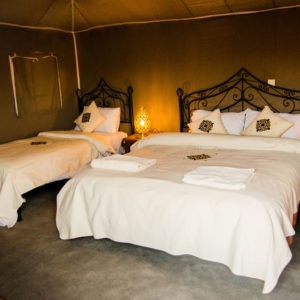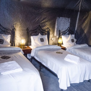 Pour la tente triple, nous avons des tentes avec un grand lit double + un lit simple et d’autres tentes avec 3 lits séparés. Les deux tentes ont une douche et une toilette privée + eau chaude et électricité.